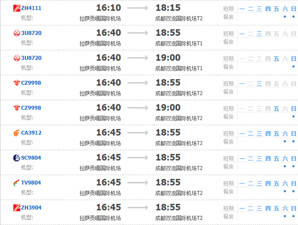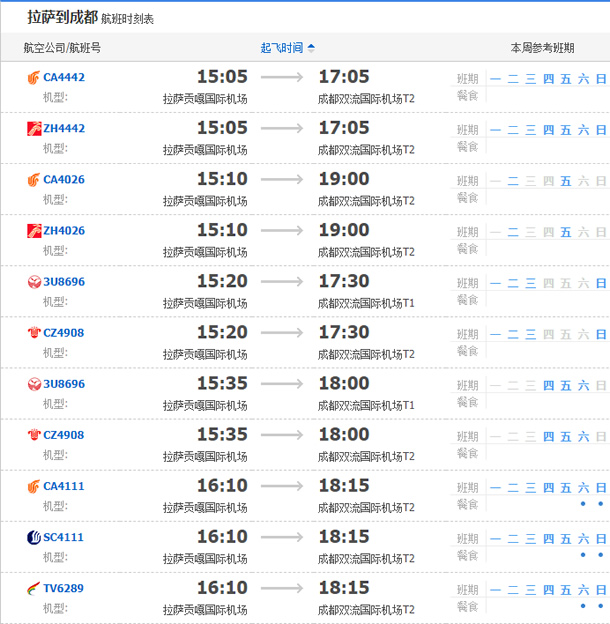 拉薩飛成都的直達(dá)航班有40個(gè),主要的航班號(hào)有四川航空3U8658 、3U8696、3U8720 ,山東航空SC4402 ,中國(guó)國(guó)航CA4402、CA4442 ,西藏航空TV6338,深圳航空Z(yǔ)H4402、ZH4111 ,更詳細(xì)的直達(dá)航班時(shí)刻表如下圖所示: