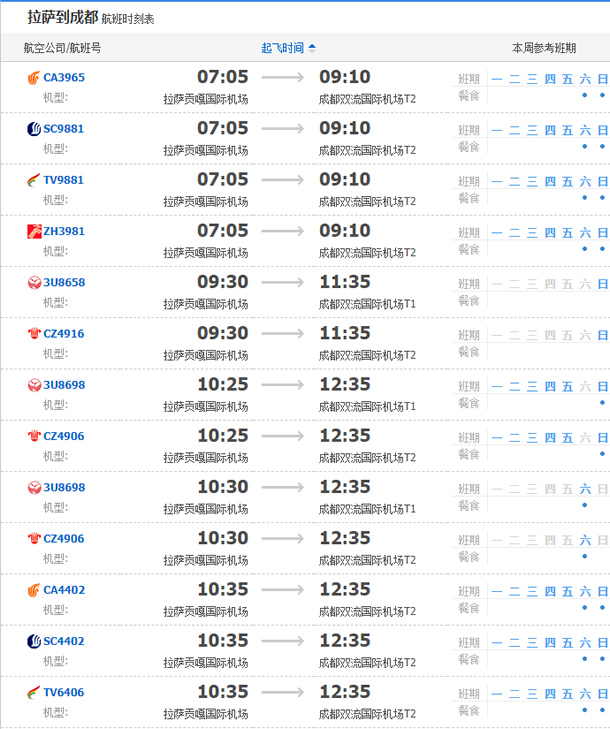 以上就是拉薩飛成都的航班時(shí)刻表,起飛時(shí)間,到達(dá)時(shí)間,及固定航班日期。